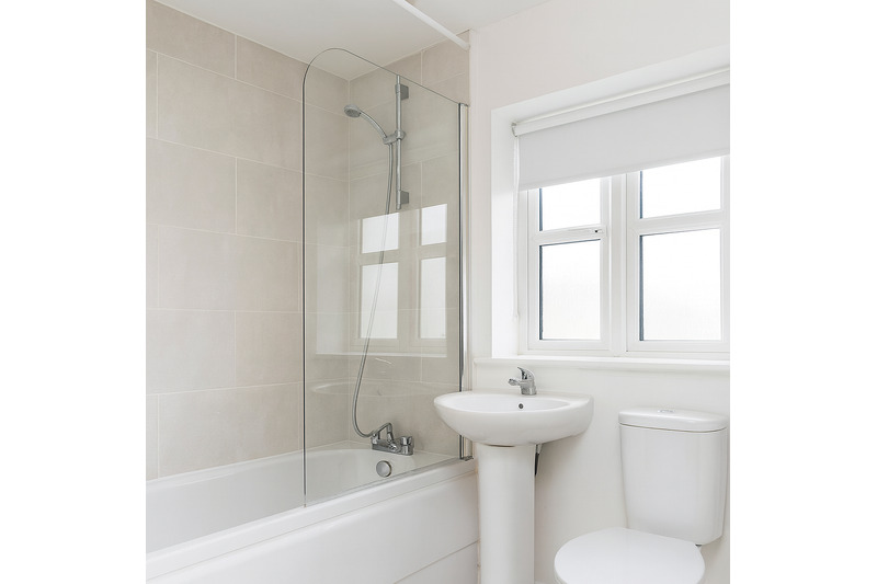 Bathroom: 06'03'' x 05'07'' (1.9m x 1.7m). Fitted with a contemporary white suite comprising; low level WC, wash hand basin and bath with overhead shower and heated towel rail.